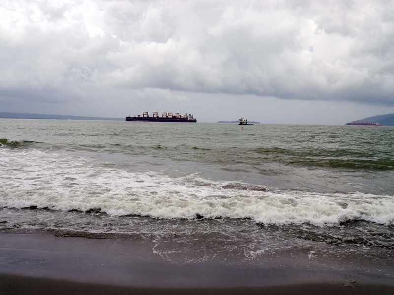先ほどのピンクの家の間を通るとビーチです。雨が続いているせいか、ちっとも青くない…、もともとプエルトガレラのような綺麗なビーチではないことは事前に分かっていましたが、今日は特に小雨がパラつく中、波はそこそこあり、まるで湘南の汚い海のようです。ガイドにはビーチは犬の糞がひどいと書いてありましたが、それほどではありませんでした。ここに来てももの売りがしつこい。