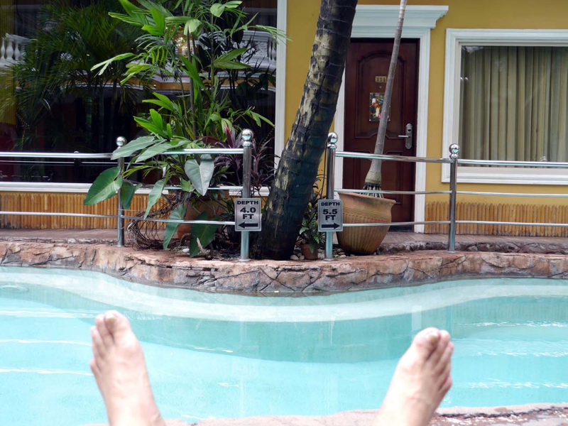 あ〜〜〜♫ これをやりたかったのです。朝から早々に出てきたけれど、今日はプール貸し切り状態、もちろんiPodも傍らに来ています。これこそこの世の天国、スービックで日光浴をするのは初めて、午前9時前から午後3時まで6時間、ずっとここに転がっていました。これをしに来たのです!