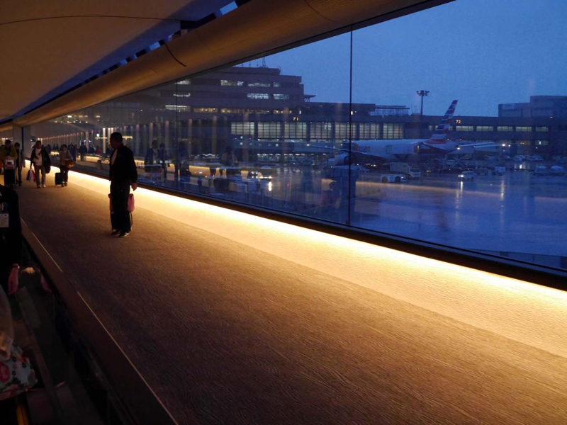 とにかく成田には着きました。外は雪から雨に変わっていそう、半分、と言うか3/4出発を諦めていたのに少し希望が。あれっ? 例の電車はいつの間にかなくなっていたようです。屋根付きの通路と歩く歩道に。トローリーを引きずって歩いて行きました。結構長い距離……。