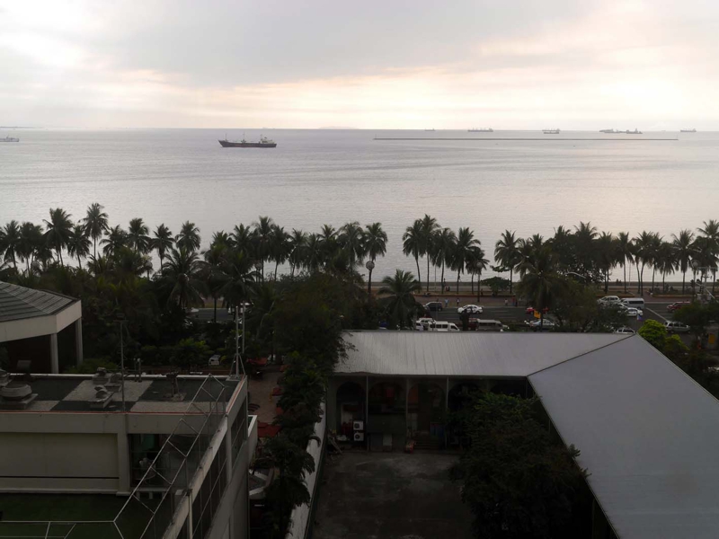 窓を開けるともう夕方のマニラ湾が一望できます。でもそこそこの曇り、またサンセットは望めそうもありません。マニラ湾を望むホテルを取って、夕刻に雲がなかったってことは未だ一度もありません。明日は午前4時前にはホテルを出て空港に向かう予定、だから荷物も殆どバラしません、
