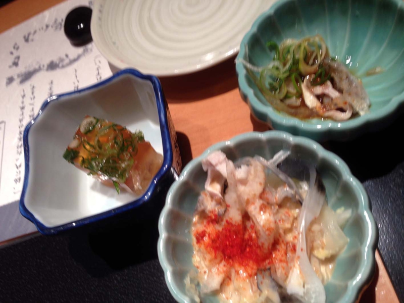 現地集合、時間通り集まって始まりました。あ〜、お腹空いた! まずはビールで乾杯! 「どうもご苦労様、それでは講義を始めて。食べながら話を聞こう。」最初は煮こごり、フグの皮、フグ刺の和え物、今日は何となく寒いし、良いタイミングだったね。