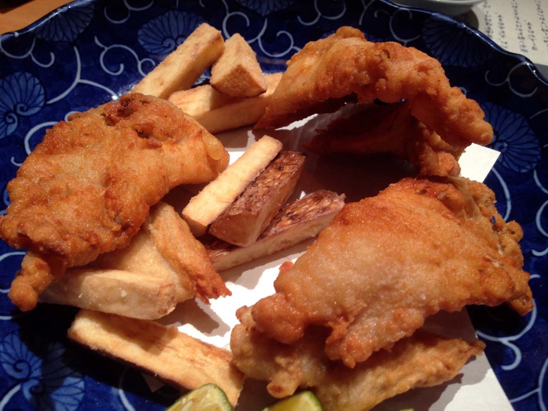 唐揚げが出てきました。そう、今日はフグのフルコースです。この骨の周りにへばりついた肉が何とも旨いんだよ(漫画”美味しんぼ”から)、しゃぶって削ぎ落とすんだよ。これも熱いから気を付けて。断然鶏唐揚より美味しいよね♪ あいにく今日は焼きフグはなしのようです。