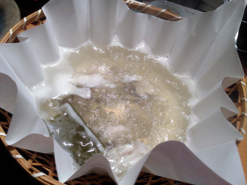 さて、鍋の登場です。この店は紙鍋? 僕は本当は土鍋の方が好きなんだけれどな。お店が片付けるのに便利なんだろうね。中に入っているのは昆布、もちろんそれ以外のダシはなし、フグからだっぷりダシが出てくるんだよ。フグって僅かな脂もないんだよ。
