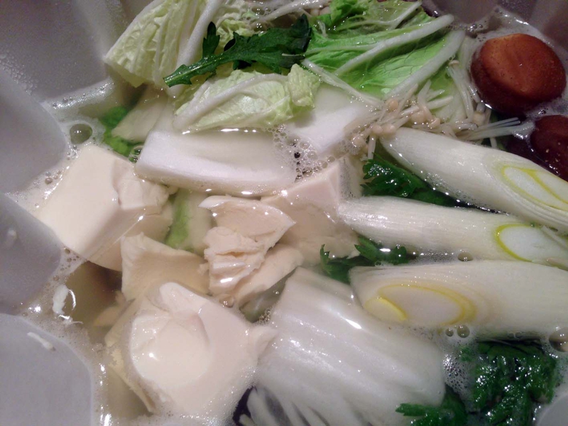 オ〜! 煮立ってきた。じゃぁ、鍋白子入れようぜ。あまり時間を置きすぎると白子が縮こまっちゃうから、そこそこのところですくい上げないとダメだぜ。その後、野菜を入れてまた煮立ったらフグを入れようぜ。済みませ〜ん、ひれ酒の継酒3つくださ〜い♪