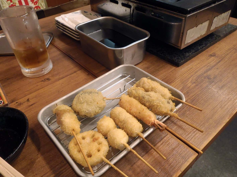 そう、こんな感じ、またビールではなくお茶でいただきました。あまり脂っぽくなく、さらっと揚げてあるよう、友人の店はソースが縦長の缶に入っていましたが、ここはむしろ横長、串を斜めに入れてグルグル回します。やっぱ旨い! 実はあまり揚げ物は食べないようにしていたのですが、今日は旅先に付きOKとしました。未だ昼間なので割と空いていました。本場の味を堪能しました。