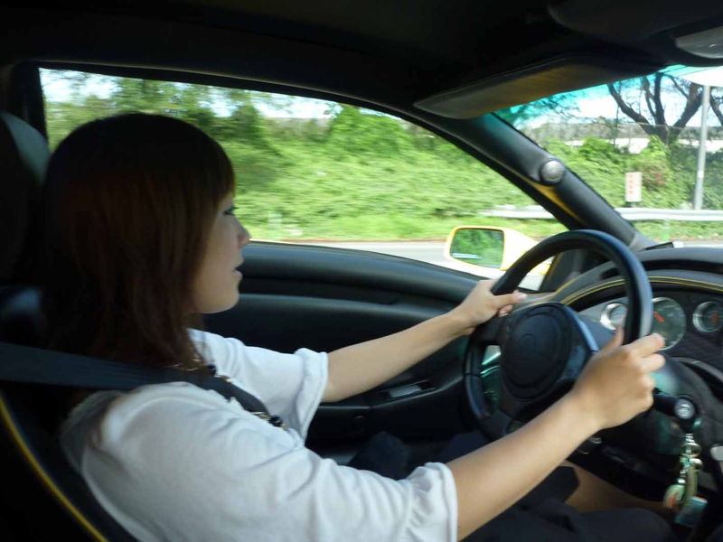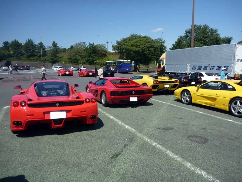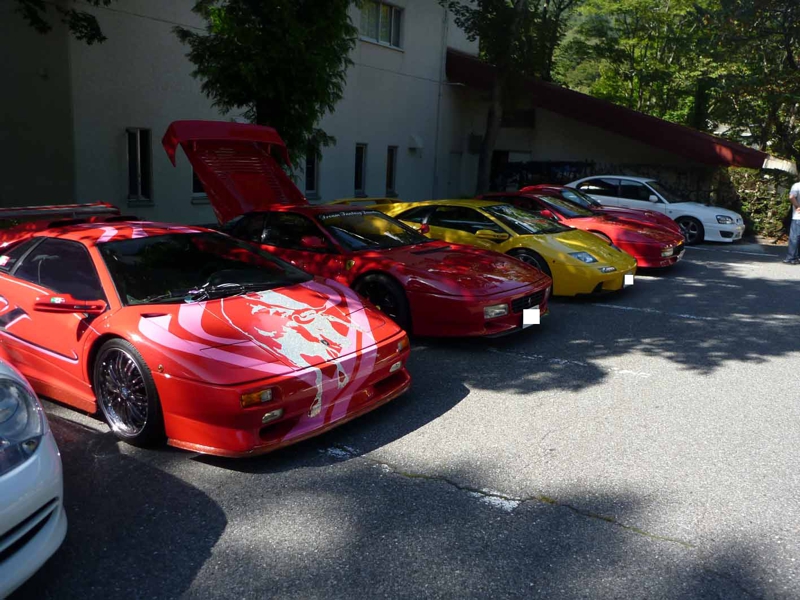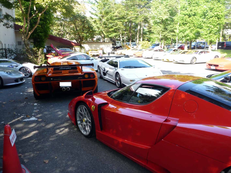 他のスーパーカーにぶつけると困るので、敢えて集団の中には入らず、端っこにポツンと駐車させました。シフトアップした後のクラッチ・リリースはゆっくり丁寧にやること、半クラッチでスロットルが少しカラカラ鳴るのはクラッチの使い方が良い証拠であることを教えました。