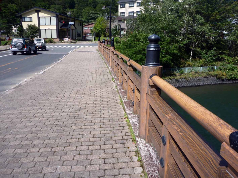 中禅寺湖橋と言うのだそうです。向かって左側が湖、右側は川になっています。ホテルはこの右側、川の手前に位置します。突き当たりの道を右折するといろは坂の下りへ。そしてその手前にお土産屋さんがたくさん並びます。