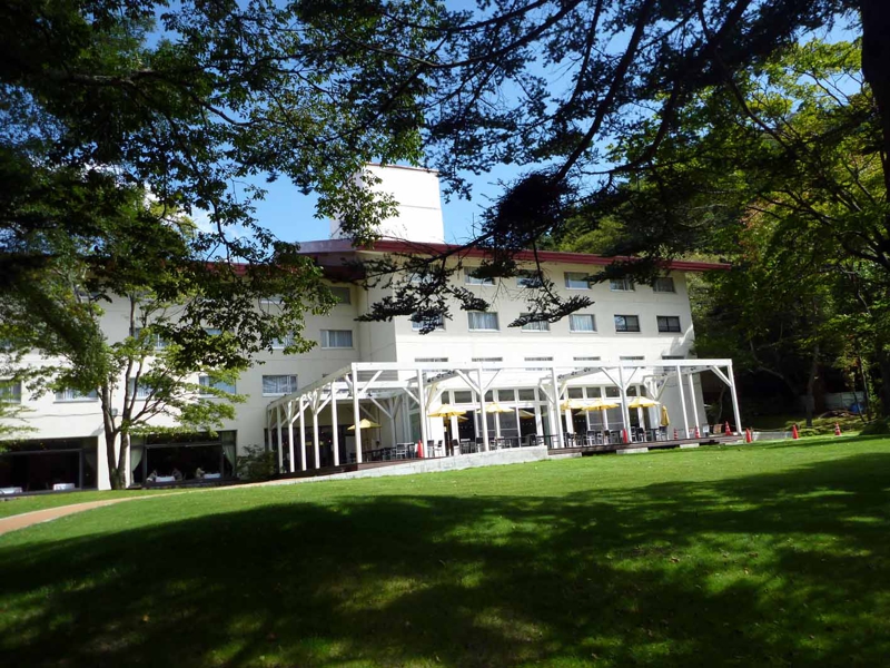 ここが湖側からホテルへ入る入り口、洒落た石作りの塀やゲートがあります。以前は金谷ホテルやプリンスホテルにも来ました。このクラブでこのホテルを利用したことがあるのだそうですが、恐らく僕は初めてのはずです。