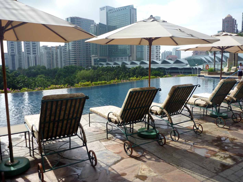 さて、出掛ける前にスイミングプールを見に行きました。僕がホテルを選ぶときに重視するのはプールの善し悪し、Webでも必ずチェックしています。今回はこのマンダリンかウェスティンが第一候補、ともに素晴らしいプールの写真があったからです。未だ時間が早くゲストは殆どいませんが、僕も午後の日差しの強い時刻に来ます。