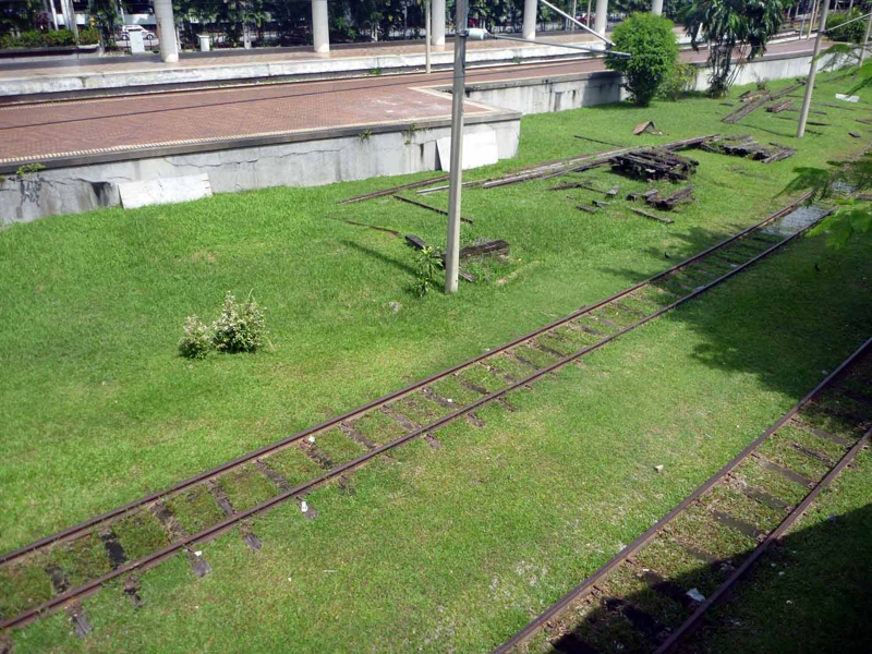 隣のクアラルンプール駅です。後で判ったことですが、この一駅の間は400mくらいしかない! 20分も待って。歩けば良かった。15分の時間を無駄にしました。駅から周りを見ると右前方に中国語の書いたビルがたくさん、だからそっち方面が中華街だと云うことが判りました。途中、もう廃線になった良い雰囲気の場所が。アメリカみたい。