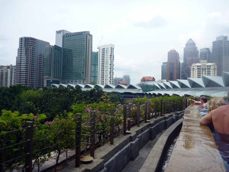 プールの淵はこうなっています。水はここから溢れ、下に水路が。Webで見たプールの写真は、まるで飛び降りると公園に落ちて行くように見えました。プールはそれほど大きくはない。しかしWebでは巨大なプールのように見えました。ちょっとずるい........。水も綺麗でものすごく素晴らしいプールに見えたのですが。天気はあいにく。