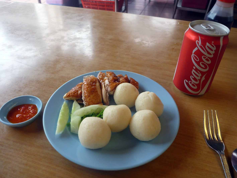まぁしゃぁない、ローストを頼みました。白い丸いのはライスボール、おにぎりよりはもっと米が練られて本来の形を失っています。チキンはKLでもそうでしたが、小骨が多い。タレもKLとは違う。何かHalf&Halfを断られたせいか、あまり美味しく感じません。ライスボールも、普通にお茶碗に盛られたご飯の方が良さそう、米の臭みが.......。