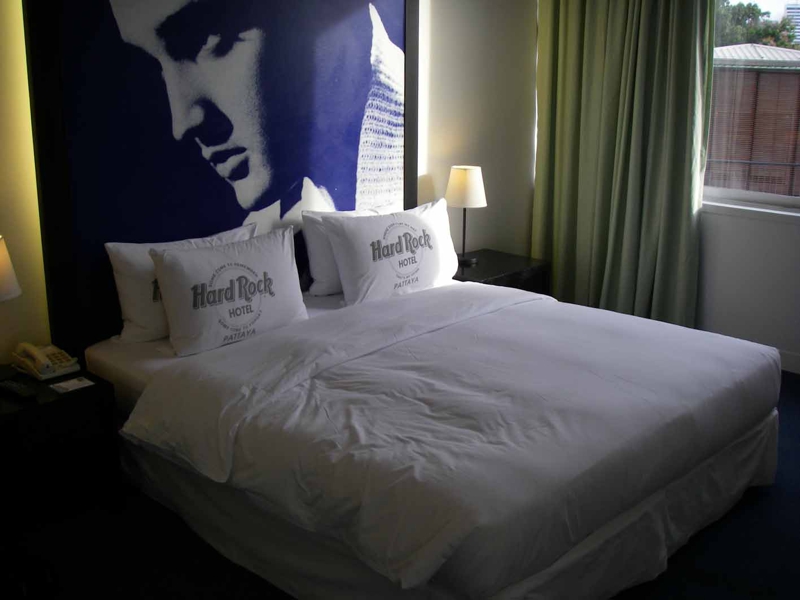 どうやら写真で見たのと同じホテルが見えて来た、やっとたどり着いたようです。夜はいろいろな色のライトが点いてきれい? 如何にもハードロック、アメリカ的な雰囲気のホテルです。もともとハードロックカフェが好き、そんなところからこのホテルを選びました。