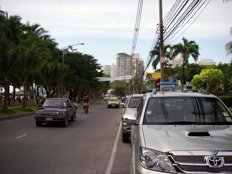ホテルの目の前が海岸通り、プールサイドから外へ出て、30秒でもう海です。海岸通りは結構車の通りが激しい。サッとは渡れません。この道は一方通行、路上の駐車もすごい。タイでは日本と同じ車は左側通行、そしてバンコックと同じく鳴らしっ放しのクラクションが響きます。