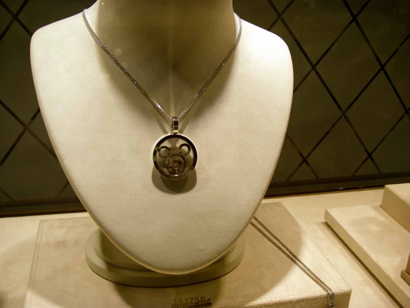 女房はミッキーマウス好き、こんなダイヤの入ったショパール風のペンダントがありました。えーと…、14万バーツ? 40万円以上になります。女房には感謝しているけれど、ちょっと無理だな? エルメスのスカーフで勘弁してもらいましょう。今日のスカーフは格好いいですよ!