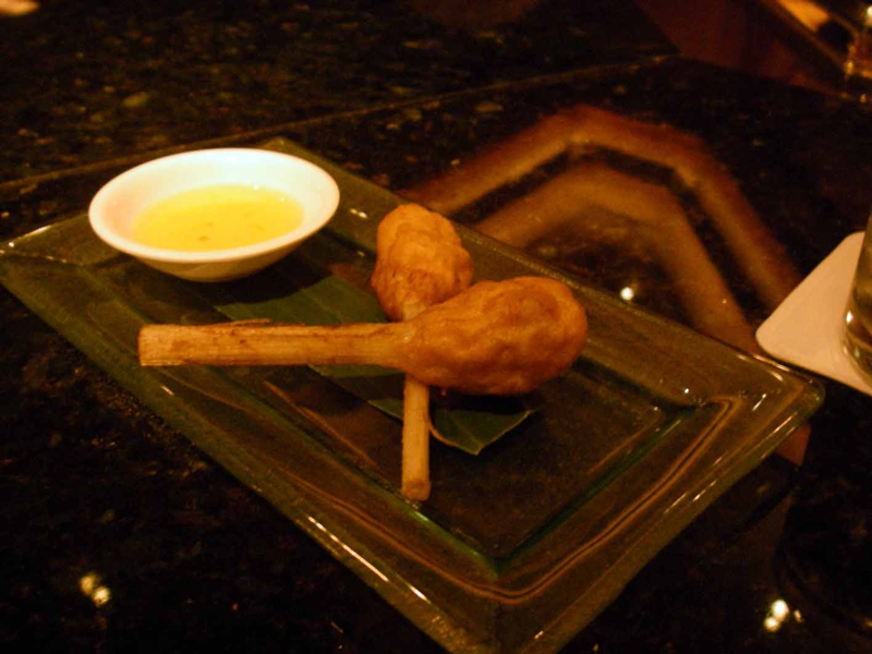 チャームが出てきました。木のスティックに鶏の挽肉? をからませて揚げたものみたいです。サッとスティックから剥がれ、なかなかの味。それから日本風のおかきも出てきました。帝国ホテルのバーでも柿の種が出てきますから。さぁ、そろそろ時間です。空港へ向います。