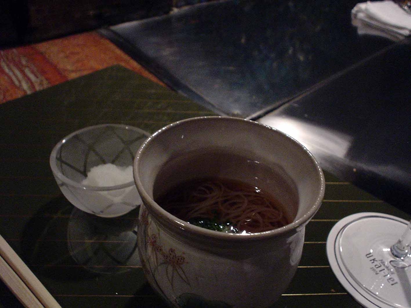 パイ生地を破いてみると、今日のスープはマツタケの澄ましスープ。外側のパイをいっぺんに中に突っ込んじゃうとスープが全部吸われて美味しくなくなります。半分くらい入れて落とし込み、あとはスープをすくいながら。