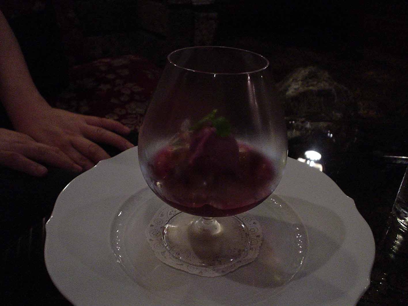 これは3種のシャーベット。イチジクのシャーベットが食べたかったそうです。ピュータの器に入っていて、冷たさが一段と引き立ちます。見た目が楽しいのはこれも美味しさの一つ。