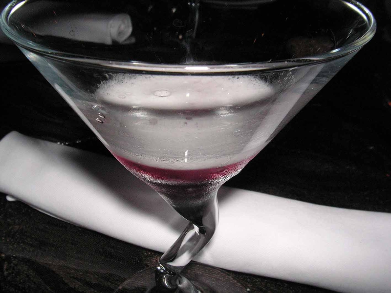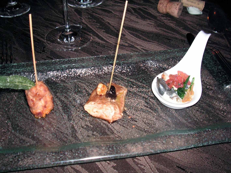まずはAmuseが数点、これは何やらクランベリーのリキュールにクリームのようなものが入ったもの。一口で入ってしまいます。しかしこのグラスの脚が妙にひん曲がっていてちょっとお洒落。そんな食器を見るのも大きな楽しみの一つ、だいぶお腹が空いてきました。