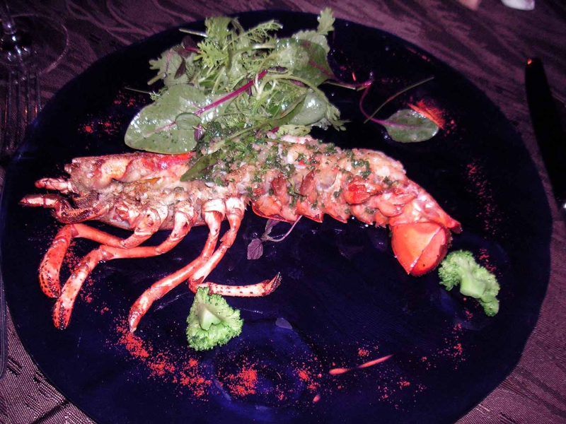 何と2品目の魚、オマール海老のグリル。濃紺のお皿にオマール海老の赤い身体が鮮やかです。品数はずいぶん多いみたい。しかし一品の量がそれほど多くはないので結構簡単に入ってしまいます。この料理は食べられるところはほんのわずか、さすがに脚までは食べませんでした。