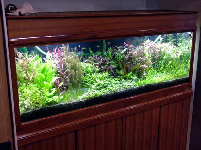 これらの条件を満たした水草水槽のことを云うようです。この本の中の文章を引用させていただくと、水草育成の技術より、各種水草の区画を如何に対照的に、しかも整然と配置するデザインに主眼が置かれていると記されています。これは、白いキャンバスの中に素晴らしい絵を描くのと全く同じだと思います。面白いですよ~、だけど難しいです。芸術的なセンスとともに、水草を育成する科学的な知識が要求されるんです。ただちょっとずるいな~と思うのは、この本の中でレイアウトされる水草は殆どが水中葉、つまり水槽の中でしばらく育成させた水草達が使われているんです。我々素人が手に入れられる水草の殆どは水上葉、つまり、植え込んでから時間が経過しないとこのような素晴らしい景色にはならないんです。過去5年間、何度もTryしては挫折して、やり直してきました。なかなか思うような水景が出来ません。そして今年もお正月休みを使って、新たに作り直してみました。これが下にある写真の水景です。何とも5番目の遠目にみると雑然としてなく、抽象的な絵のように見える、というのが至難の業です。やはり抽象的な絵のようにはなかなか