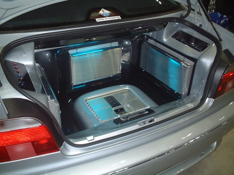 フロントのラゲッジ・スペースは二人一泊分の荷物が積めるように残して貰いました。アクリル板で仕切ることと、ネオン管を付けるのは私が頼みました。ブルーでほんのりと上品に? もっと派手でも良かったんだけれど。CDチェンジャーはトランクではなく、室内に収まりました。
