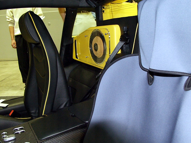 彼らが一番苦労したと云うガルウィング・ドアへのメイン・スピーカーの設置。ドアは上に持ち上がるわけですから、緩衝材が人工大理石などで重ければドアは開かなくなります。そこで! このショップが特許を持っている軽い緩衝材が使われているとのこです。スピーカーをインストールしても、油圧ダンパーの効果でドアは途中まで持ち上げると、あとは油圧で自動的に開いていきます。
