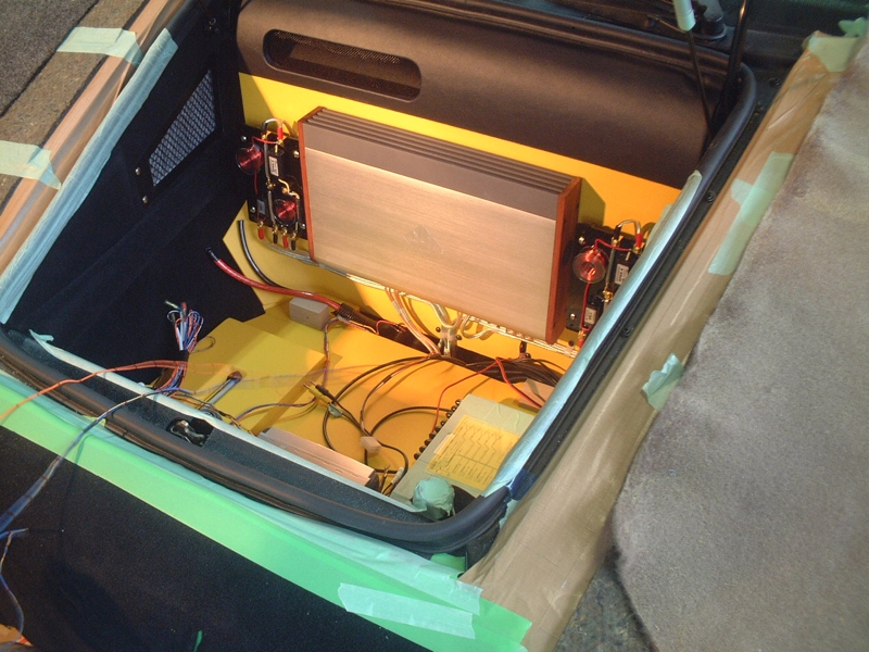 フロントのラゲッジスペースに設置されたパワーアンプ、フェラーリではマッキントッシュ製100W☓4、今回はメーカー、及びショップの依頼を受けてイタリアのPHD製50W☓4のアンプ。フェラーリの時の半分のワット数になりますが所詮狭い室内、それほど大パワーは必要ないと判断しました。このPHDと云うメーカーは私にとっては未知でしたが、ショップの提案を信頼しました。