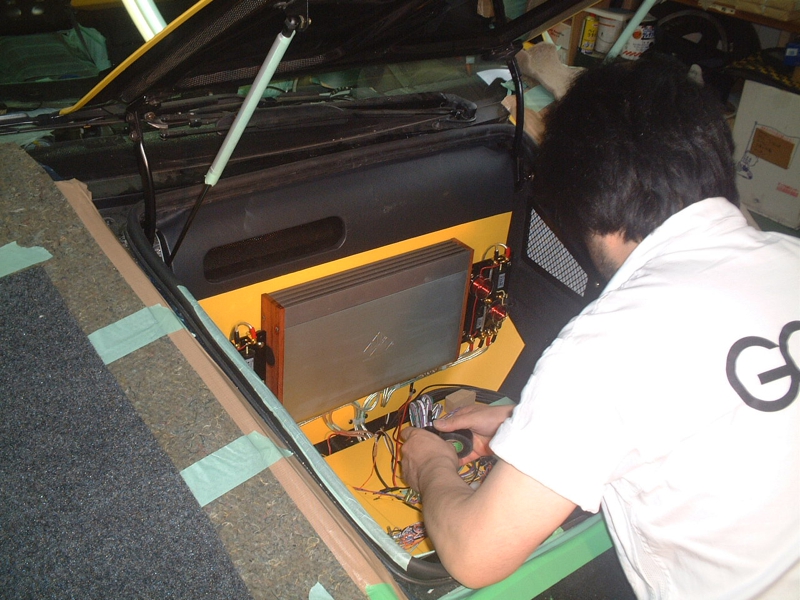 Ferrariにはサブ・ウーハーはつけませんでした。でもそうすると重低音が寂しい。今回はもっと予算がないのに、ローンを組んでつけてもらうことにしました。やはりボディの色と合わせて黄色の緩衝材を。そして頭に音が直撃にならないようアクリル板のディフューザーを張ってもらいました。