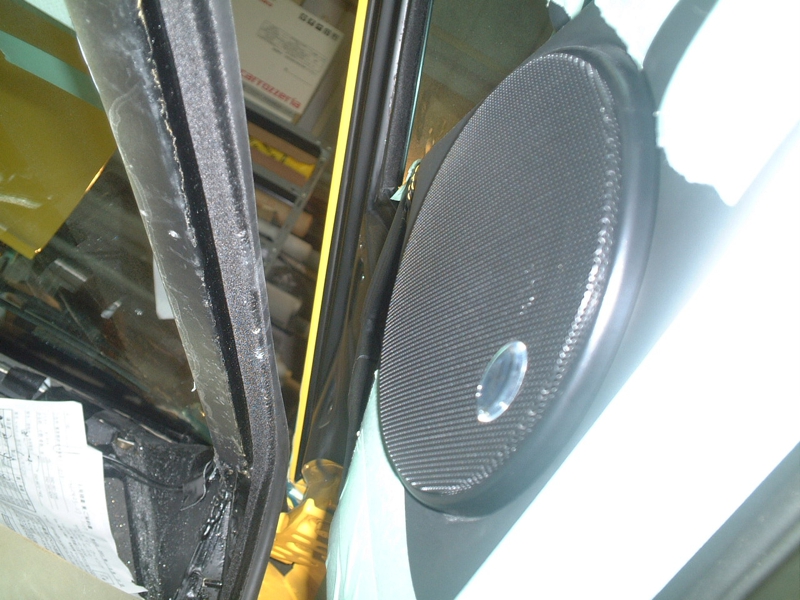 もともと純正でダッシュパネルの高さにツィーターが付いていましたが、音に関してうるさいショップのスタッフ曰く、「ツィーターは耳の高さにないとダメ!」 と云うことで純正のフロント・ピラーの内装を剥がしてまでツィーターを高い位置に設置しました。その出っ張りの部分のなめらかなフィニッシュはさすが! と思わせるものでした。ツィーター…、たかが小さなスピーカーですが。