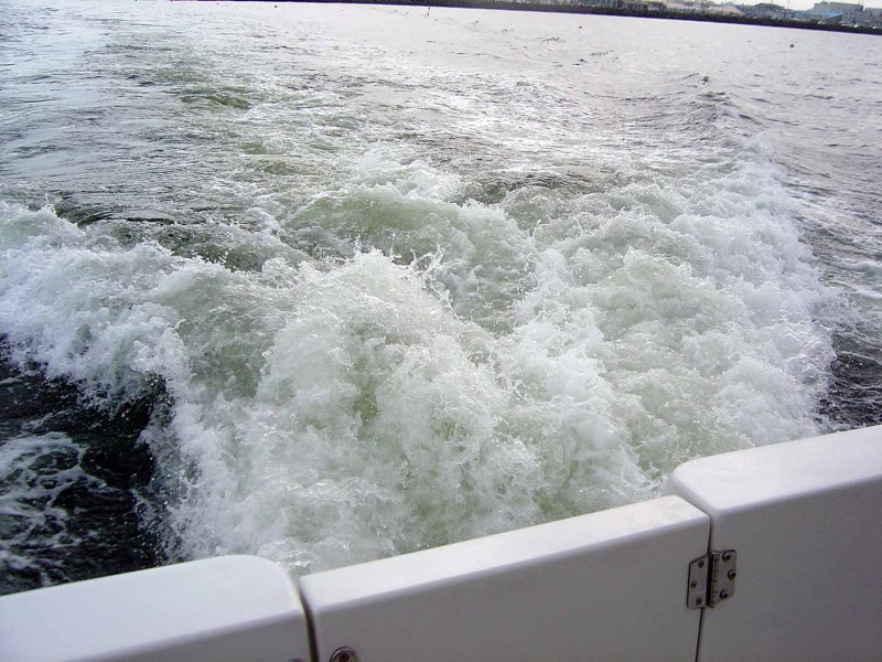 ベイサイドマリーナを出て沖合いに向かいます。エンジンの音は野太いディーゼル音、お腹の底に響くような快感です。そう、速くはないと云ってもそこそこのスピード、みるみる岸が遠のきます。