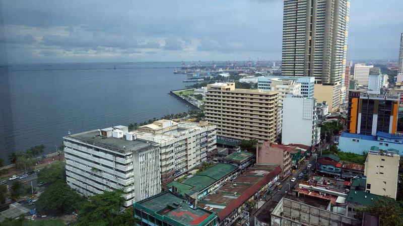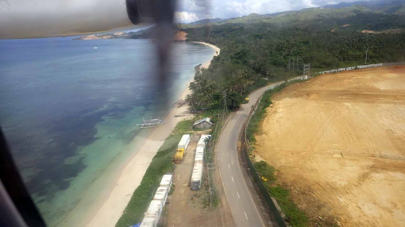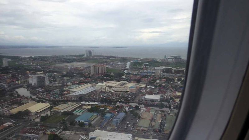 大きく旋回しながら海を目指します。飛行機もバイクも傾けないと曲がらないことを知ってはいますが、「いいよ、無理して傾けなくて!」と言う気分になってきます。マニラの街を上空から眺めながら、一路楽園へと向かいます。とにかくここまでで気疲れしました。この先どうなることやら。