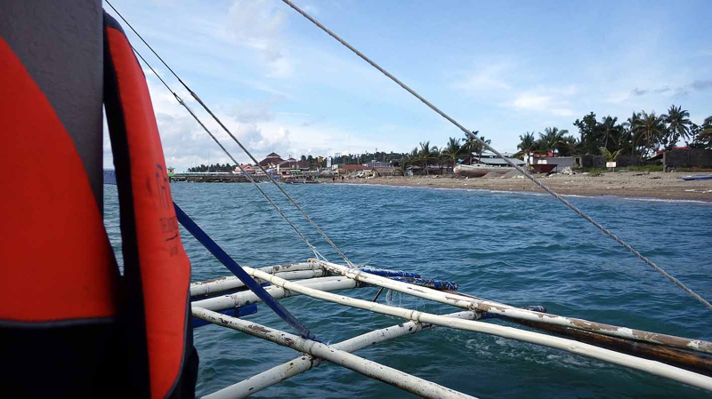 天気は何となく怪しく、更に陽も傾き始めたので、残念ながら真っ青な海とは行かないまでも、穏やかな波の海ははるばる4000km彼方から来たゲストを迎え入れてくれるよう、「良く来たな!」と語りかけてくれるようです。向こうに見える陸地はもう別の島、飛行場のあるバナイ島と言います。