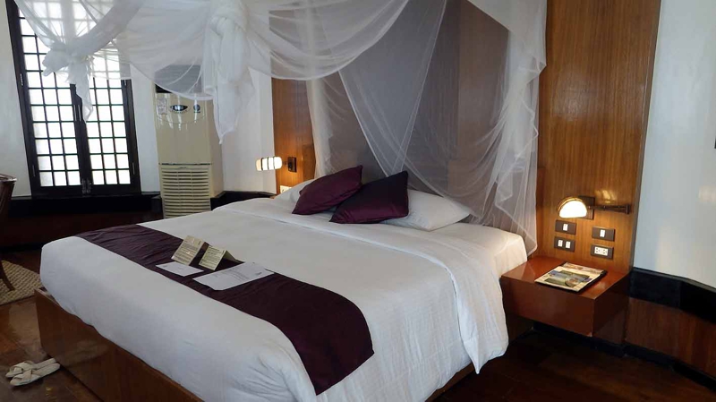 部屋の中はこんな感じ、如何にも南国風の造りでベッドはキングサイズ、大型のエアコンもバッチリ効いていてだいぶ涼しくなっています。冷蔵庫、セーフティボックスはちゃんとついていて、セキュリティは良さそう。床は木製のフローリングで、裸足でも大丈夫そうです。ベッドの寝心地も良さそう。