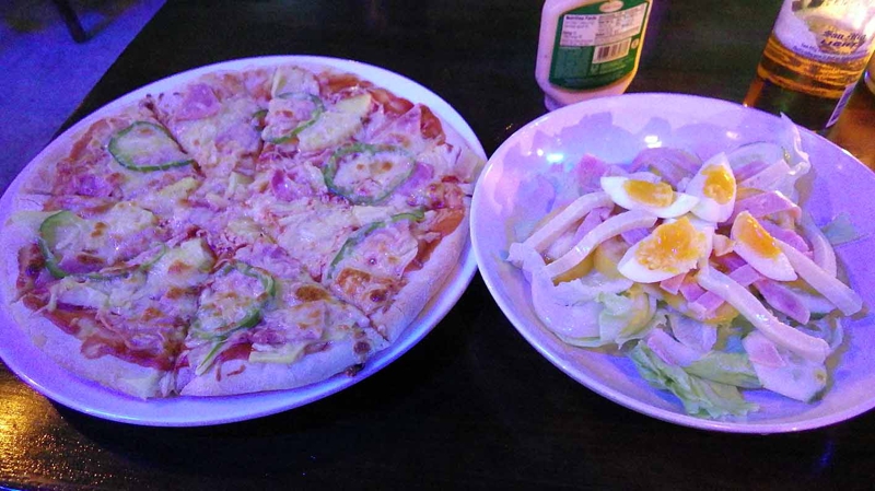 結局夕食はあまり重いものにせず、ピザとサラダ、そしてサンミゲルライトが本日のディナーとなりました。しかし散々ウェイトレスにピザは一人で食べきれる大きさか、念を押して尋ねたのですが、食べきれません。8ピースと云うより僕は直径を尋ねていたのですが。結局残しました。