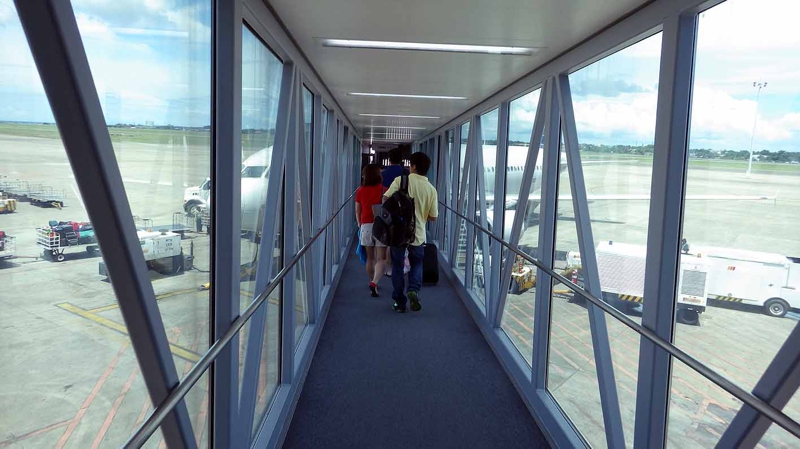 こんな通路が妙に安心感をもたらせます。だって今までバスに乗ったり、飛行場の中で地面の上を直に歩いて低いタラップを昇り、ちっぽけなプロペラ機に乗っていたのですから。どうやら機材はフランス製のエアバス、頼り甲斐があるような気になりました。ここからマニラまで1時間ちょい。