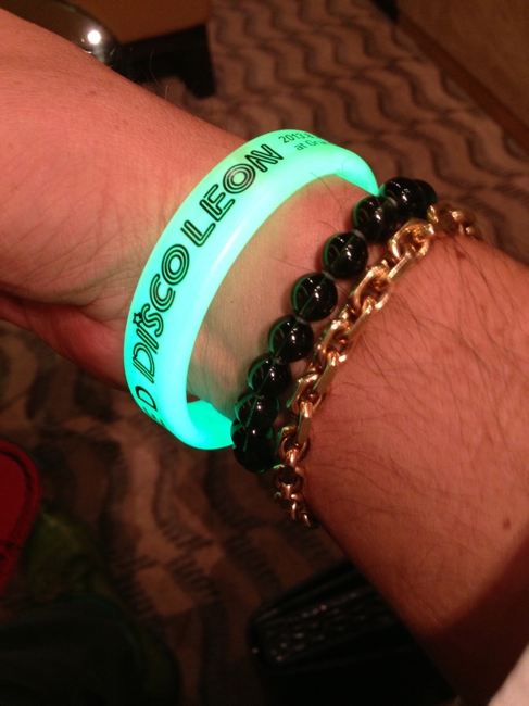 受付で手続きを終えると男性はグリーン、女性はピンクに発光するブレスレットをくれます。今日はガーネットのブレスにゴールドのチェーンをしてきました。ちょっとジャラジャラになってしまいます。