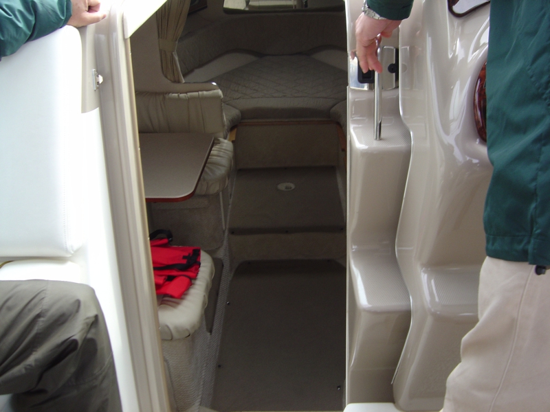 デッキに出る階段は横にスライドするとキャビンへの入口になります。対面のソファ、テーブルにベッド。ベッドはやや狭いですが、二人転がれればそれで充分!?