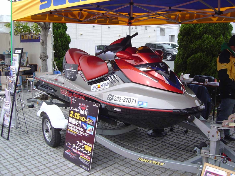 受付にSEADOOのマリンジェットが展示してありました。ヤマハやカワサキに比べて絶対にスタイルはこちらの方が上、しかしSEADOOは故障が多いと聞いていました。容赦なくスタッフにその辺を攻め入ると、最近は非常に故障が減ったとのこと、エンジン設計に余裕が出てきたことがその理由だそうです。このマシンも最高にかっこいいですよ! 170万!!