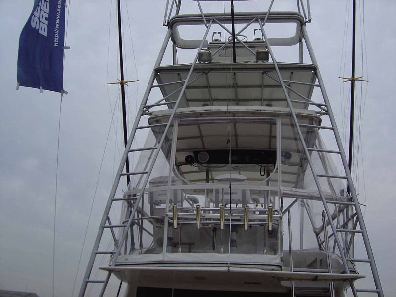このタイプは雨の多い日本ではあまり売れないと聞いています。それに冬は結構寒そう。だから完全に部屋になっているコンバーチブルタイプの方がもてはやされる訳です。でも絶対こっちの方がかっこいい! 寒いときや雨の時は乗らなければ良いだけのことです。それにしても28Ft以上ありそうな堂々としたいでたちです。