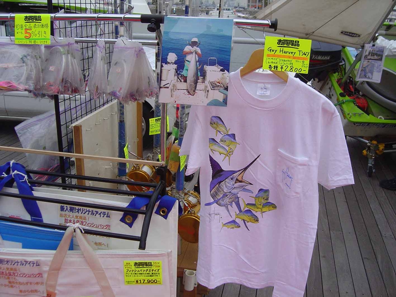 最近ではこんなマリングッズにも胸ときめくようになりました。いつかはこんなカジキマグロにチャレンジするのか? 船のクルーでお揃いのTシャツを着たりするのも大いに楽しそうなところ。また船の小物を見て歩くのも楽しいものです。写真の魚は大きなマグロ? こんなのが釣れた日にゃもう連日海に出ていくことになりそうです。