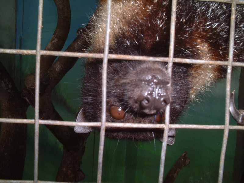 敷地内に鳥小屋があり、その中になんと大きなコウモリがいました。なんとも無気味な顔。目が合うと「キ~ッ!」と大きな声で怒るように鳴きます。こんなのが飛んできたらちょっと恐いね。