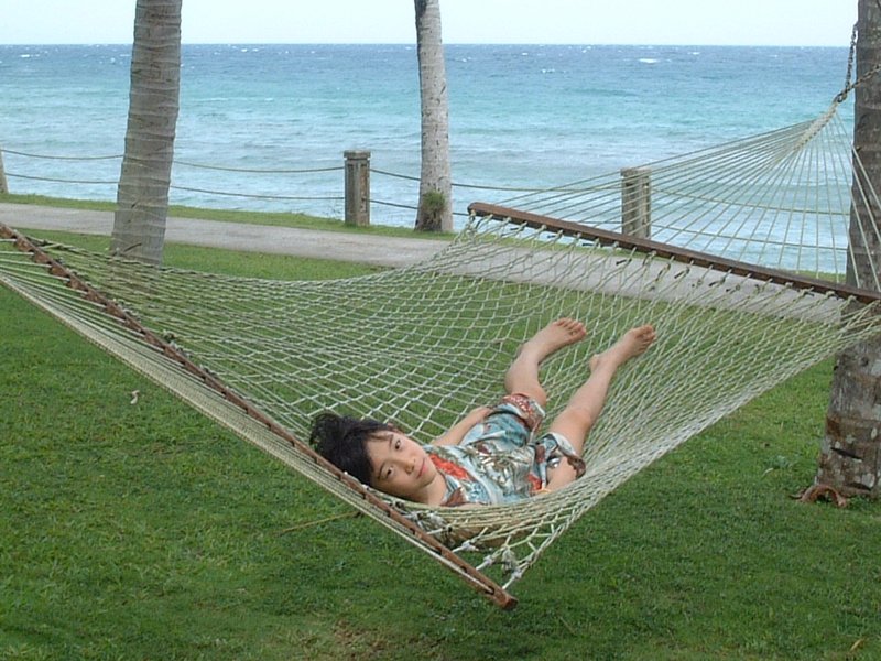 ところどころにハンモックが吊ってあり、自由に使えます。娘もご満悦の様子、ただ気を付けないと、クルッと回転して地面に落ちてしまいます。昼寝も快適そう。