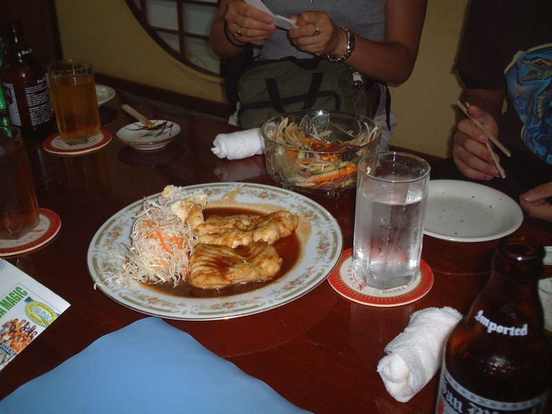 これ、ナポレオンフィッシュのガーリック・ソテー。病みつきになりそうなくらい美味しかったです。ちょっとグロテスクな魚ですが、ホントに美味、そう云えばオコゼもそうだし、器量と味は反比例?