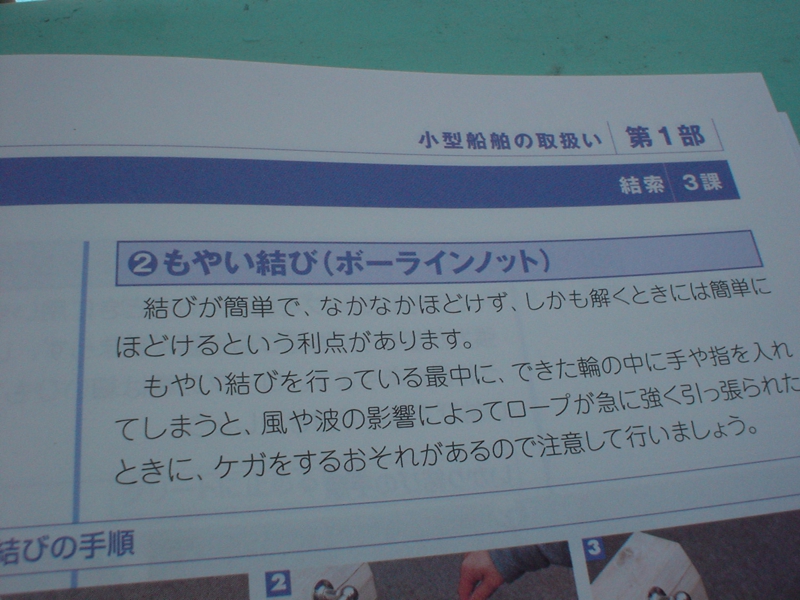 一緒に受講している仲良しはどうやら東京湾で仕事をしているとのこと。私がなかなか憶えられないことをもう既に初めからマスターしているようです。その同級生は亀甲縛りが得意なんだって、何だよ、それ? いつ使うんだよ? じゃぁこういう風にやれば? ちゃうちゃう、とにかくバリエーションは良いから一つの方法で確実に憶えたいんだよ! 尋ねる人によってやり方が違うけれど結果は同じ、そんな中で本当に苦しみました。教官に尋ねても、こうだろ? こうだろ? でおしまい。