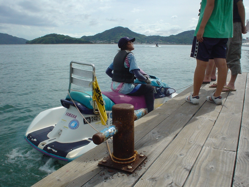 私も初めてマリンジェットを操縦しました。後ろに乗せてもらったことはあるのですが、オートバイとは違った特性があります。カーブではスロットルを開けるほどお尻を滑らせて小さく回れる。これが明らかにオートバイと違うところです。陸上でこれをやったら間違いなく転倒です。ブイの間を通過するのにもちょっとコツが要ります。