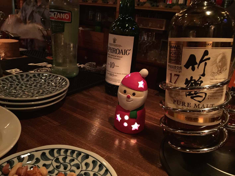 歩いて3分、いつものBarへ来ました。今日はラッキーなことに空いていて、他に1組のカップルだけしかいないみたい、カウンターのど真ん中の特等席に座りました。僕は例によってラフロイグのオンザロック、女房と娘はウォッカでした。それといつものプロシュート(生ハム)をオーダー。もうお店にもクリスマスの雰囲気が漂います。じゃぁ再度カンパ〜イ! 僕はラフロイグがあればOK!