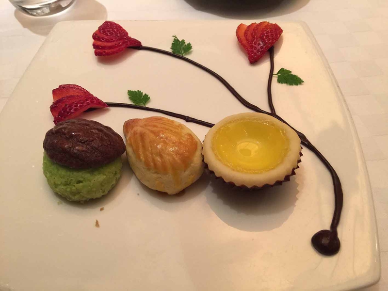 デザートは各自二つ付きます。まずは点心三種盛り、みんな一口で入ってしまう軽いものなので、お腹いっぱいでも負担になりません。一番右、ナッツの風味にクリームの入った点心が何とも美味しいです。お皿にはチョコレートと木苺?で描かれた絵が何とも可愛くお洒落、もったいないのでその点心でチョコレートをすくって食べます。やっぱり焼きそばと鶏の唐揚げが余分だった? 結構苦しい。