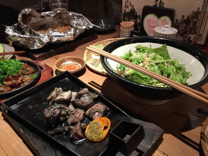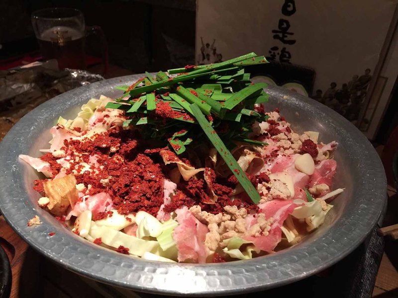 この店は九州の農場直営、鶏肉の炭火焼きは最高! サラダと一緒に始めました。そして今日は鍋が食べたかった、本当はこの店のモツ鍋が食べたかったのですが、あいにくメニューから外れていました。ニラと唐辛子の入った辛い豚肉の鍋をオーダー。見てていかにも辛そう、でもニラが美味しそうです。