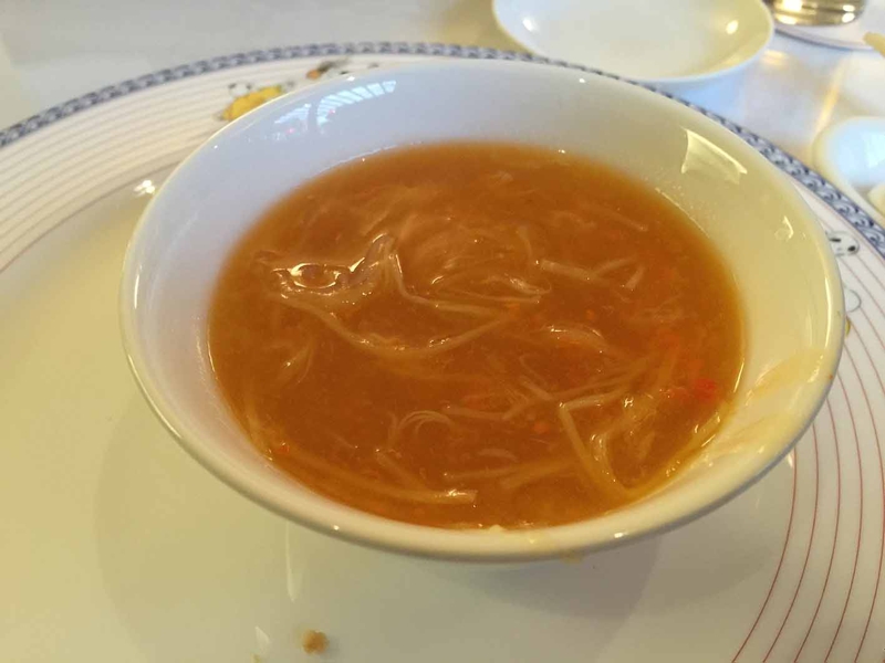 そして衣笠茸とカニの卵入りのフカヒレスープが出てきます。カニの卵が入っていても僕は平気で食べてしまいます。さすが、美味しい。ビールが終わり、紹興酒をボトルで行きます。